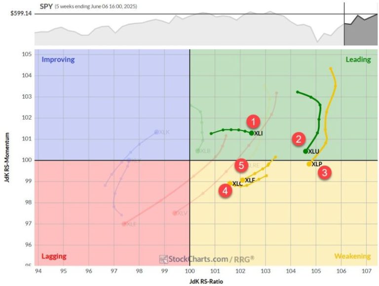 The weekly Relative Rotation Graph (RRG) continues to paint a picture of gradual shifts. Utilities and Consumer Staples, while still occupying high RS ratio levels, are moving lower on the chart. Utilities clings to the leading quadrant, but Consumer Staples has just crossed into weakening territory.